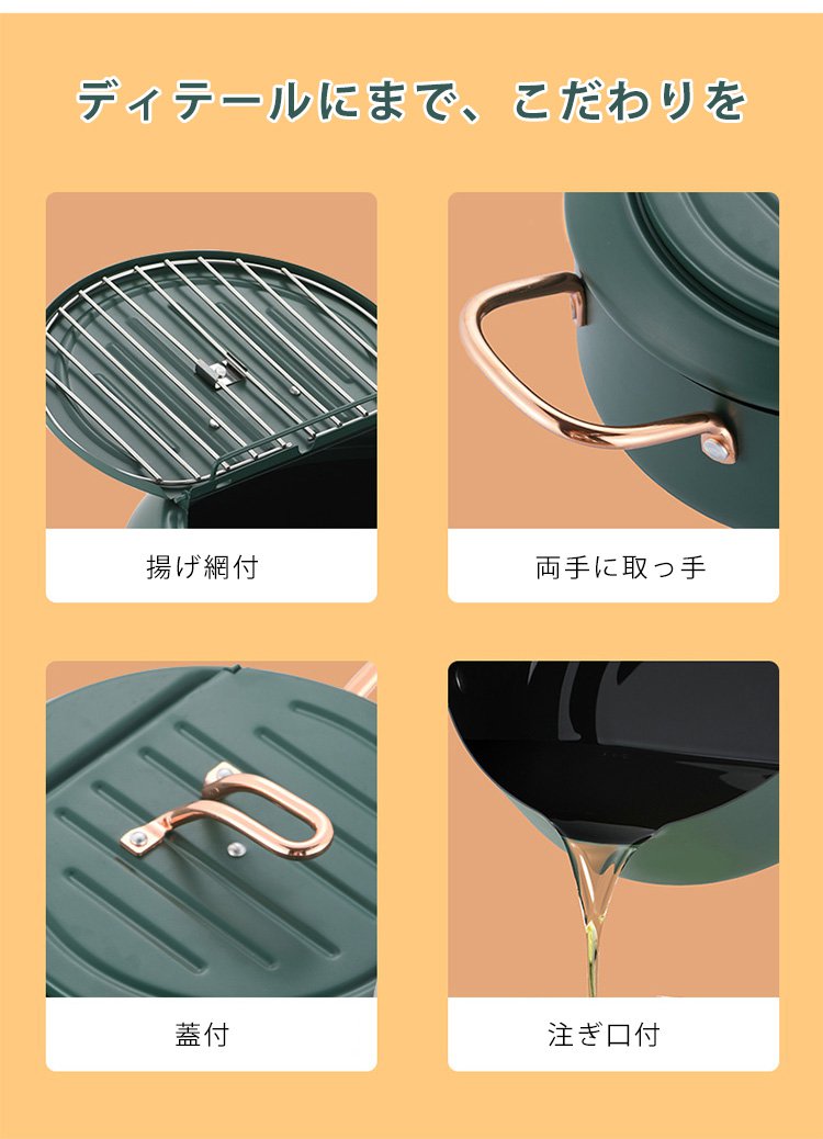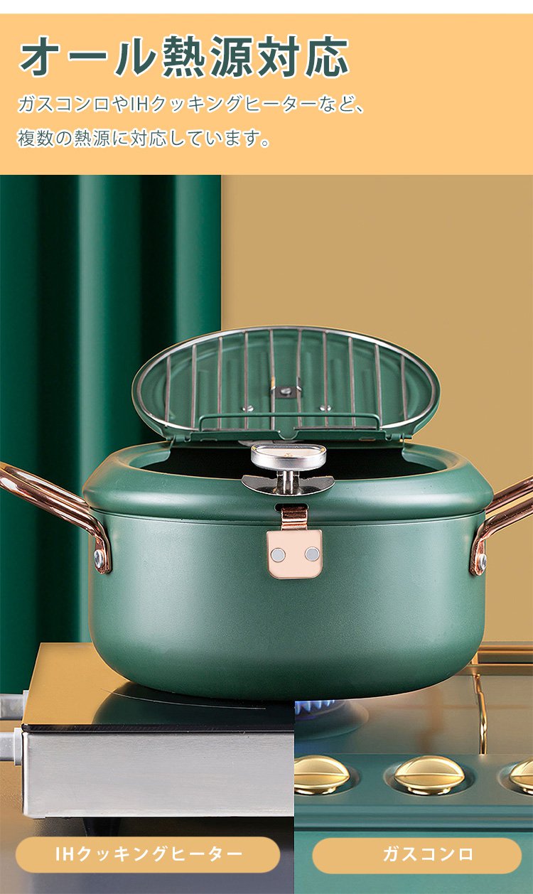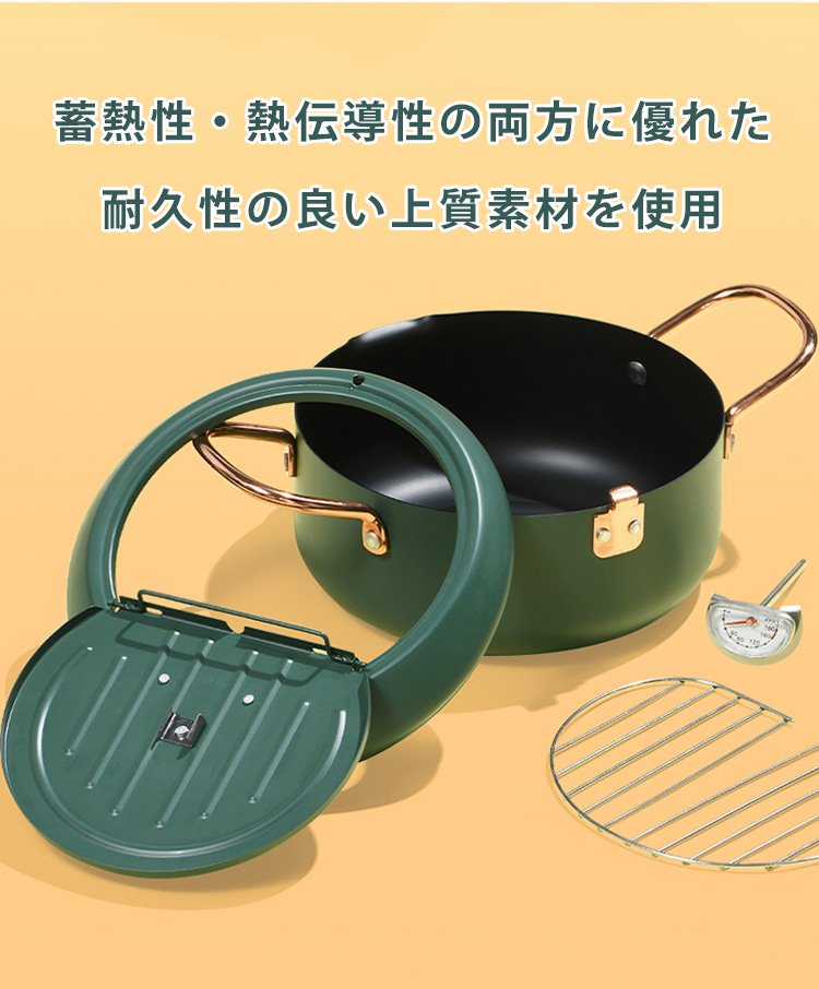 高品質な素材の天ぷら鍋と温度計のクローズアップ
